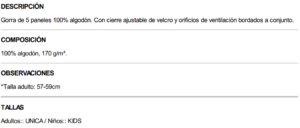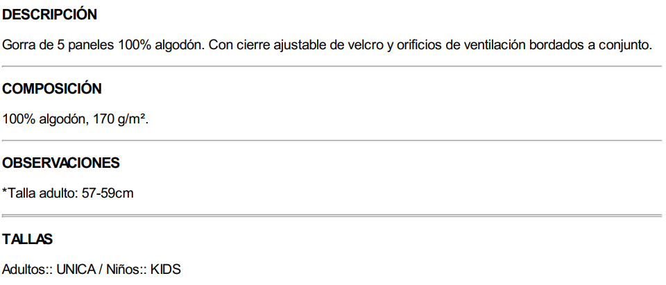La gorra dispone de un cierre ajustable de velcro, facilitando un ajuste rápido y cómodo para diferentes tallas. Su tejido es apto para bordado a máquina, garantizando un acabado limpio y profesional en gorras destinadas a empresas, eventos o promociones.