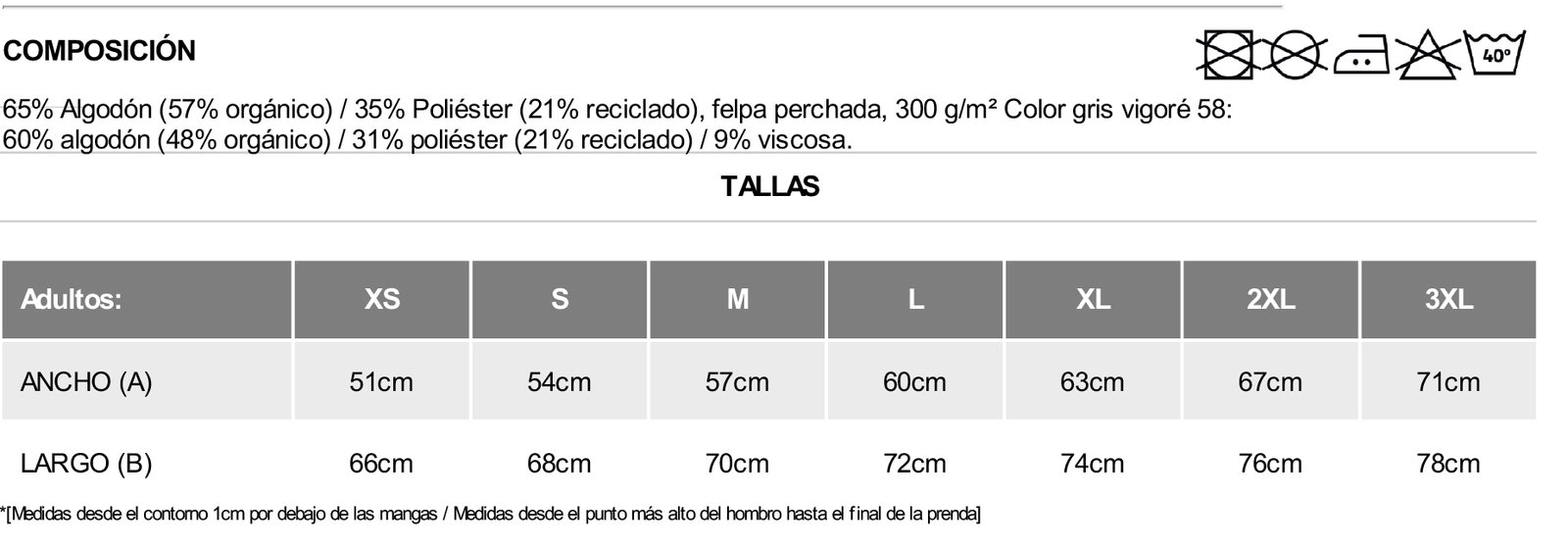 Su diseño de cuello redondo, junto con puños y cinturilla en canalé 2×1 con elastano, proporciona un ajuste confortable que mantiene la forma lavado tras lavado. Todas las costuras remalladas refuerzan la estructura de la prenda, aumentando su durabilidad y aportando un acabado más sólido.